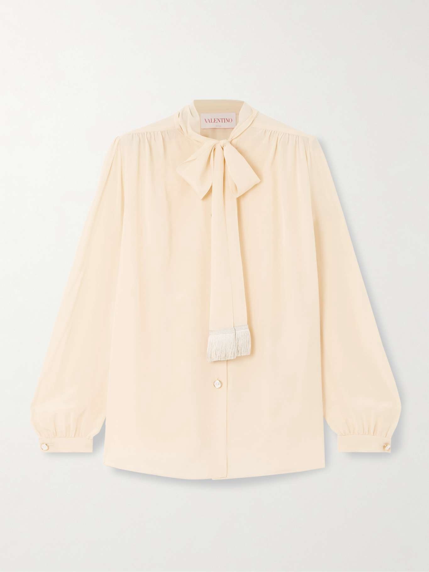 7. Valentino Fringed pussy-bow silk-chiffon shirt Peach