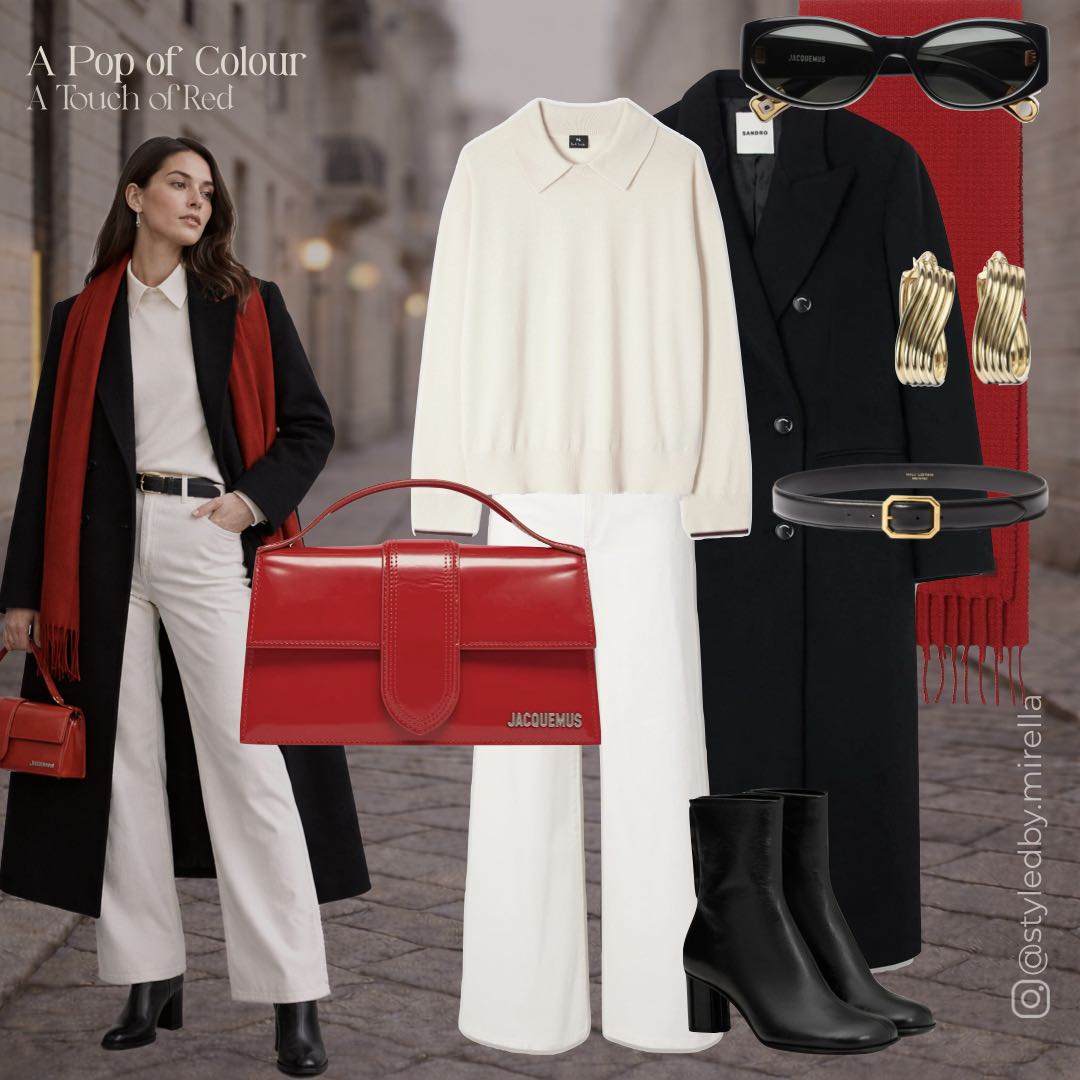 styledbymirellaSuggestedAMI ParisBLACK LEATHER PIANO BOOTSJACQUEMUSLe Grand Bambino Patent Leather Top-Handle Bagrag & boneMila Scarf - Fiery RedPaul SmithWomen's Cream Merino Wool Knit Collared SweaterNILI LOTANANAIS BELTSTONE AND STRANDSwerve 10kt gold earringsKHAITEDane high-rise wide-leg jeans WhiteSandroLONG WOOL COATJACQUEMUS x LINDA FARROWThe Ovalo sunglassesA Touch of RedRed doesn’t need much explanation. I like it best when it’s just one piece — a scarf, a bag — against black, white, and clean lines. Strong, but still easy. Let the colour do the work. #apopofcolour #redaccent #classicstyle #modernwardrobe #styledetails #effortlesslooksAMI ParisBLACK LEATHER PIANO BOOTSJACQUEMUSLe Grand Bambino Patent Leather Top-Handle Bagrag & boneMila Scarf - Fiery RedPaul SmithWomen's Cream Merino Wool Knit Collared SweaterNILI LOTANANAIS BELTSTONE AND STRANDSwerve 10kt gold earringsKHAITEDane high-rise wide-leg jeans WhiteSandroLONG WOOL COATJACQUEMUS x LINDA FARROWThe Ovalo sunglassesAllAdd a commentNo comments62 likes
