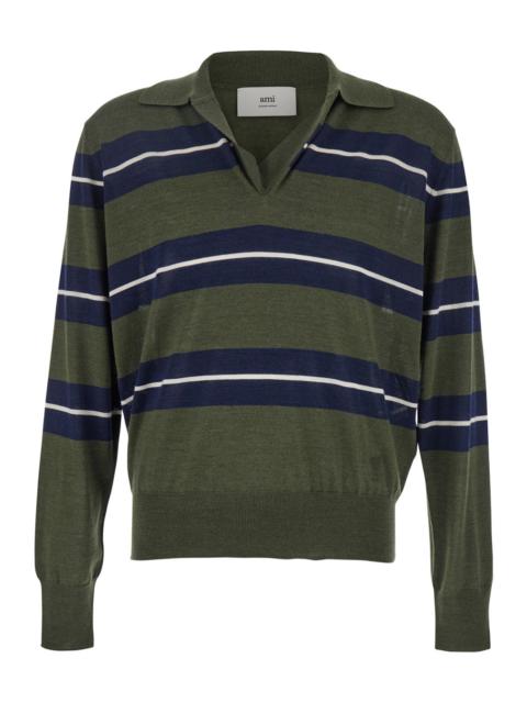Ami Paris Men Green Polo With All-Over Striped Motif And Polo-Style Collar In Wool And Silk Blend Ma
