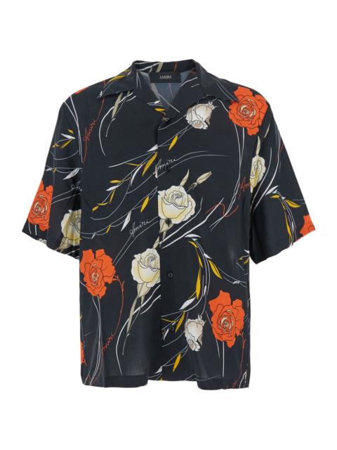 Amiri Men Black Bowling Shirt With Cuban Collar And All-Over Floral Motif In Viscose Man
