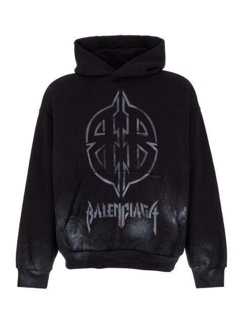 Balenciaga Men Black Hoodie With Metal Bb Stencil Motif In Dirty Effect Cotton Man