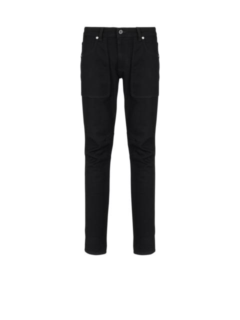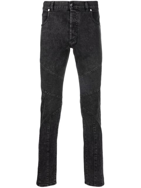 Slim cut faded and ridged black cotton jeans with Balmain monogram on hem