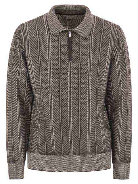Brunello Cucinelli Men Vanisé Chevron Cashmere Sweater With Polo Neck And Zip Opening