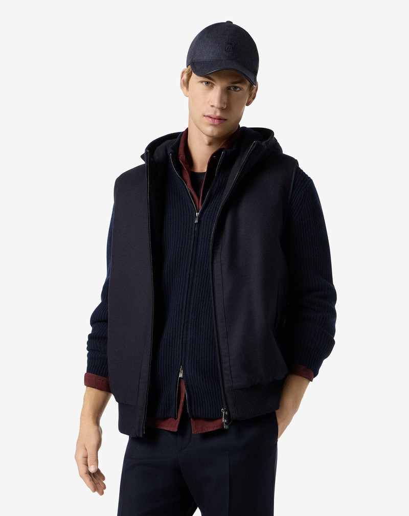 Blue technical cashmere gilet with hood