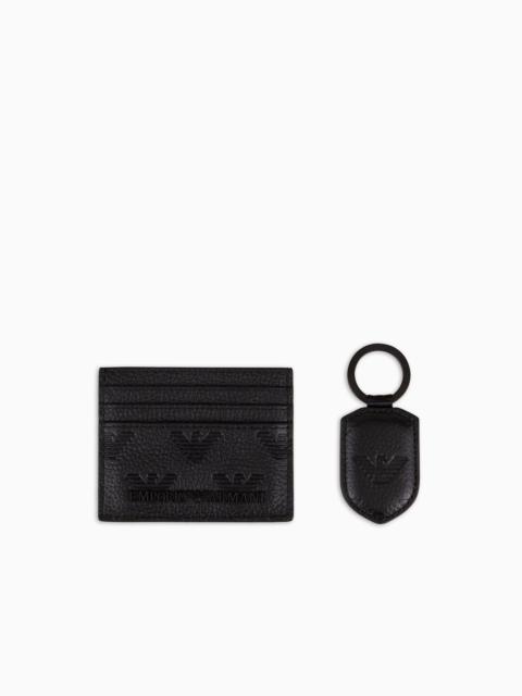 Gift box with leather wallet and keyring with all-over embossed eagle