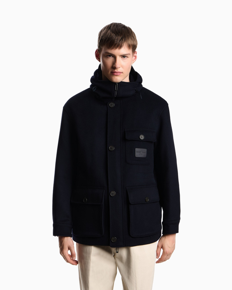 Double-breasted blazer in a soft wool-blend cloth with a nylon hood