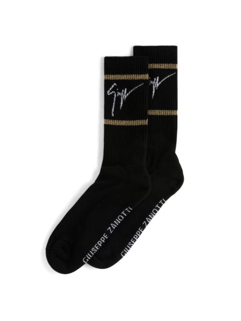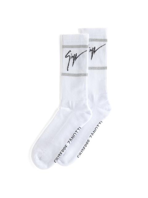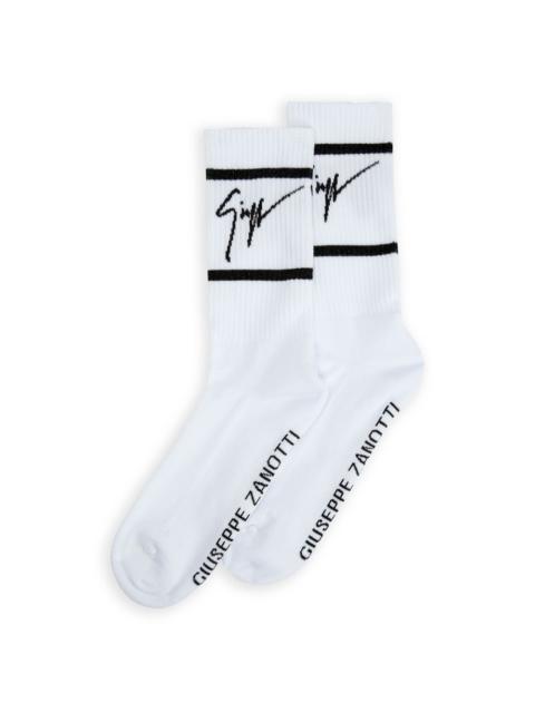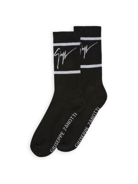 Upgrade your wardrobe with Giuseppe Zanotti accessories, featuring an exceptional range of men's socks. Each pair embodies the brand's unique fusion of sophistication and comfort, crafted from premium materials to ensure both durability and style. Discover our exclusive collection that seamlessly blends classic elegance with contemporary flair, perfect for adding a touch of luxury to your everyday essentials.