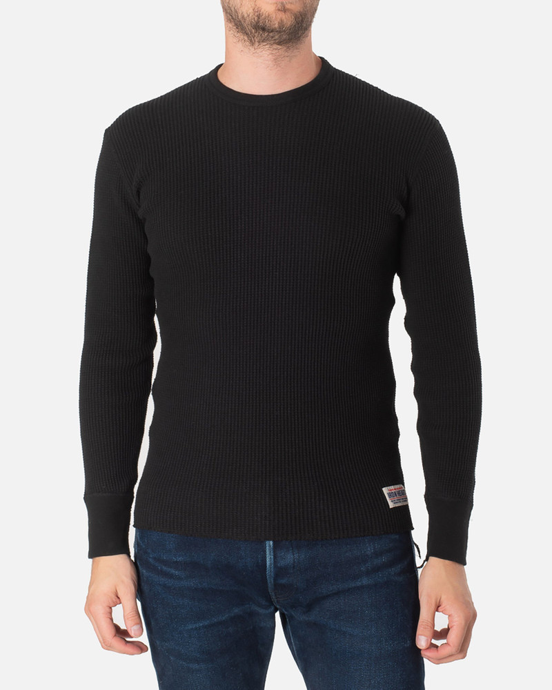 WAFFLE KNIT LONG SLEEVED CREW NECK THERMAL TOP - BLACK