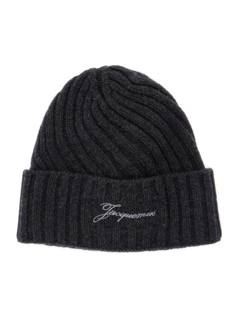 Jacquemus Men 'Le Bonnet Tourni' Grey Beanie With Turn-Up Brim And Logo Lettering On The Front In Wo