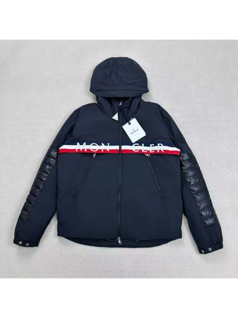 Moncler navy blue down jacket with large red logo