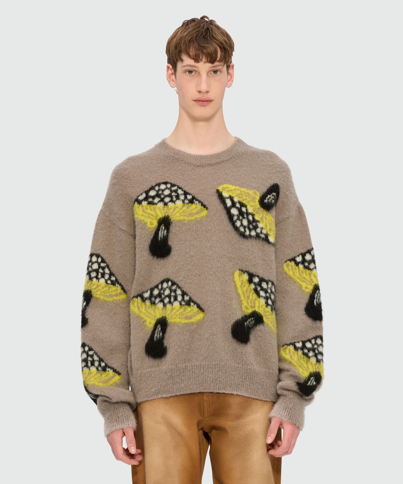 Gray brushed mohair sweater with "Fantastic Mushroom" jacquard pattern