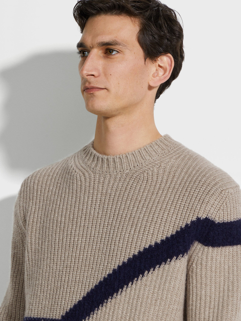 LIGHT TAUPE STRIPED CASHMERE AND SILK CREWNECK