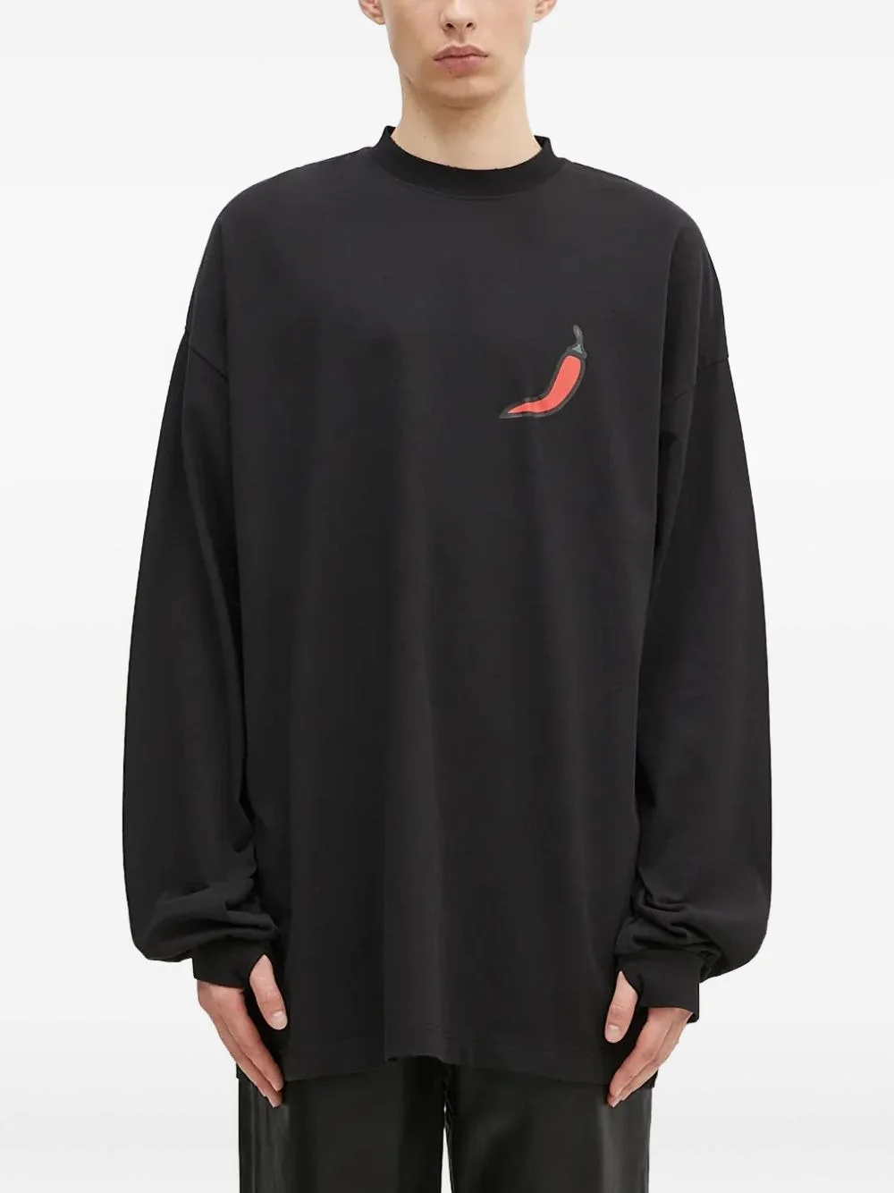 chilli-print long-sleeve T-shirt Highlights - Black - Chilli pepper graphic - Workshop graphic - Long sleeves - Crew neck Imported Composition Organic Cotton 100% Washing instructions Read Manufacturer Guidelines