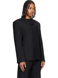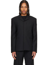Plain-woven stretch wool-blend blazer. · Notched lapel · Button closure · Welt pockets at front · Padded shoulders · Embroidered logo patch at sleeve · Button vent at cuffs · Central vent at back hem · Welt pockets at interior · Full logo-woven satin lining Supplier color: Black Body: 52% polyester, 43% wool, 5% elastane. Trim: 100% cotton. Lining: 50% viscose, 50% acetate. Made in Lithuania 252843M195000