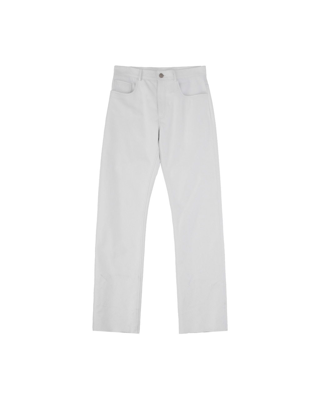 Five pocket white leather pant with prominent Mark Flood print on back pocket. Color: White - Self: 100% Cow Leather - Lining: 100% Vi - Pocket Lining: 100%Co