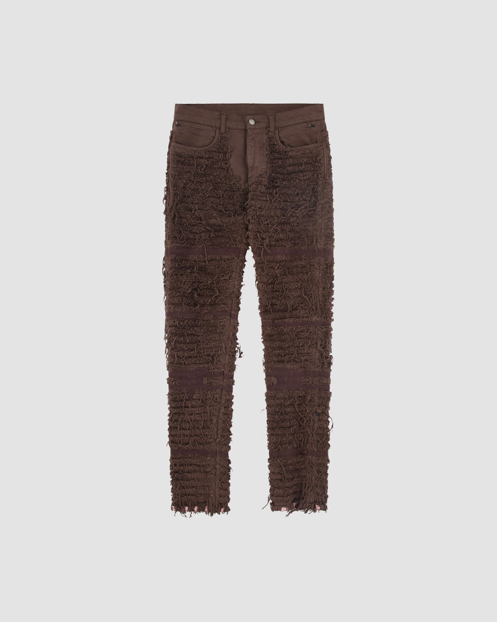 Part of the Blackmeans collaboration. Our 6 Pocket Jean with signature shredding technique and embroidered details. Color: Brown - Made in Italy - 98% Cotton, 2% Elastane - True to size