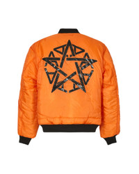 Classic Alyx reversible bomber jacket. ‘No Stylist Tour’ graphic text on outer, with collaborative contrast logo on orange inner. Color: Black - Self: 100% Pa - Lining: 100% Pl - Padding: 100% Pl