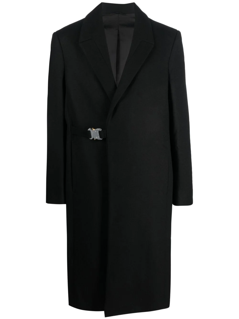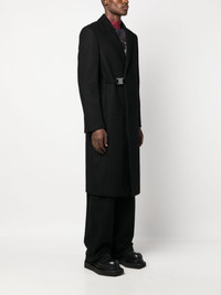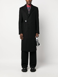 buckled wool-blend coat Adhering to 1017 ALYX 9SM's contemporary aesthetic, this black coat features a traditional wool-blend silhouette secured with a rollercoaster buckle on the front. This contrasting detail enhances the timeless design while emphasising the label's distinctive style. Highlights - Black - Wool blend - Peak lapels - Shoulder pads - Long sleeves - Buttoned cuffs - Two side slit pockets - Central rear vent - Straight hem - Knee-length Made in Italy Composition Lining: Cupro 100% Outer: Wool 80%, Polyamide 20% SIZE & FIT Model measurements Height 6 ft 2 in(1.89 m) Bust/Chest 39.76 in(101 cm) Hips 37.4 in(95 cm) Waist 29.92 in(76 cm) FittingInformation Designed for a boxy fit, intended for a loose fit throughout The vented hem offers movement at the rear Made from a midweight non-stretch fabric This piece fits true to size – take your usual size Washing instructions Dry Clean Only