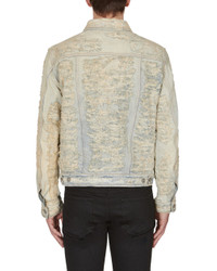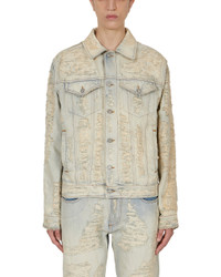 100% cotton destroyed denim jacket. Color: Tan Denim Blue - Self Fabric: 100% Co