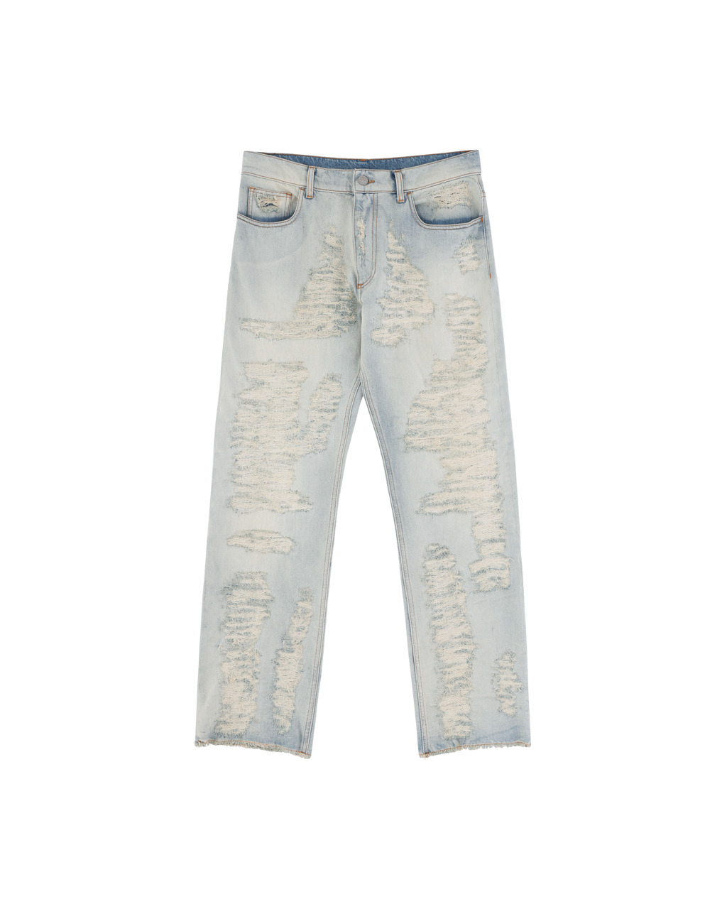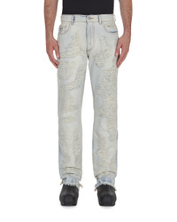 Heavily embroidered jean in a destroyed fabric. Color: Tan Denim Blue