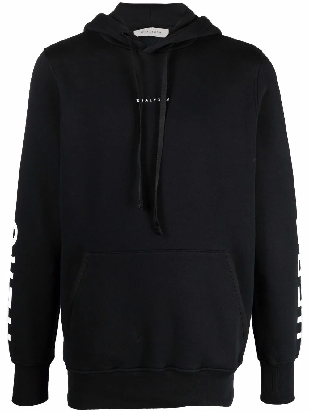 graphic-logo print pullover hoodie black/white cotton blend graphic print to the rear logo print at the sleeve embroidered logo at the chest drawstring hood long sleeves straight hem Imported Composition Cotton 80%, Polyester 20% SIZE & FIT Model measurements Height 6 ft 1 in(1.85 m) Bust/Chest 35.82 in(91 cm) Hips 37.79 in(96 cm) Waist 29.13 in(74 cm) Washing instructions Machine Wash