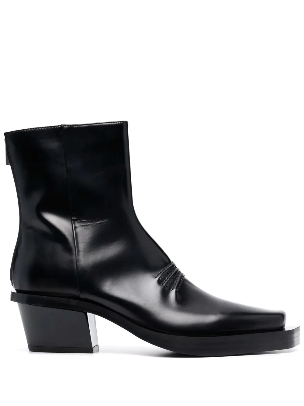 Leone leather ankle boots 1017 Alyx 9SM brings a contemporary edge to footwear, presenting these Leone ankle boots. Crafted from black leather, the pair are defined by the three stitched gathers to the upper and the exaggerated welt. An angled square-toe completes the modern aesthetic. Highlights - Black - Leather - Stitched gathered detailing - Angled square toe - Rear zip fastening - Low block heel Made in Italy Composition Outer: Leather 100% Sole: Leather 100%, Rubber 100% Lining: Leather 100% SIZE & FIT Measurement CIRCUMFERENCE 9.44 in(24 cm) HEEL 1.77 in(4.5 cm) HEIGHT 6.69 in(17 cm) Sole height 0.78 in(2 cm)