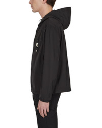 Windbreaker in recycled nylon, silver zipper with silver metal logo, large front pocket, elastic cording to cinch hood with silver toggles to adjust, side slits, nylon webbing at back with jacquard logo. Color: Black - 100% Nylon - True to size