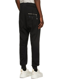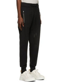 Slim-fit cotton fleece lounge pants in black. Mid-rise. Rib knit dropped inseam and cuffs. Three-pocket styling. Drawstring at elasticized waistband. Tonal logo, graphic, and text embroidered at front legs and back pocket. Silver-tone hardware. Supplier color: Black 100% cotton.