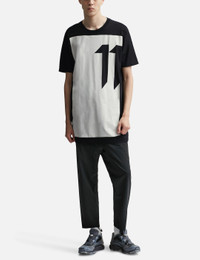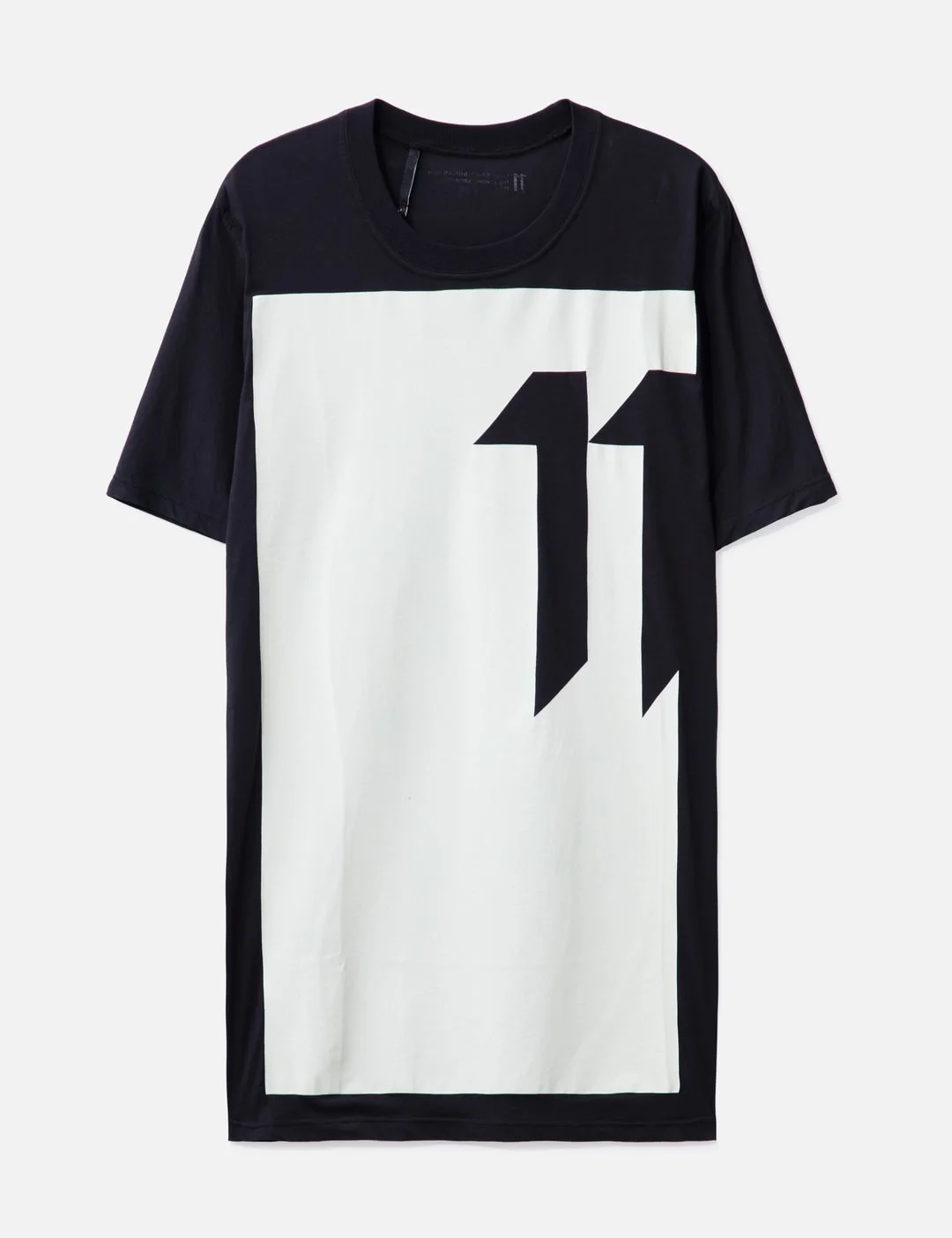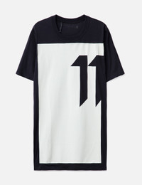 - 11 By Boris Bidjan Saberi - TS5 F1101 Block Print Short Sleeve T-shirt - Made from a light-weight cotton jersey - Long, vertical box silhouette - Ribbed crewneck - Short sleeve - Block logo print of “11” on the front - Logo print on back - Color: Black - Material: 100% Cotton - See more SS T-Shirts, T-Shirts and Clothing SIZING - Model wears size M - Model measures: Height 189cm, Chest 31.5"/80cm, Waist 27”/69cm, Hip 34.3’’/87cm