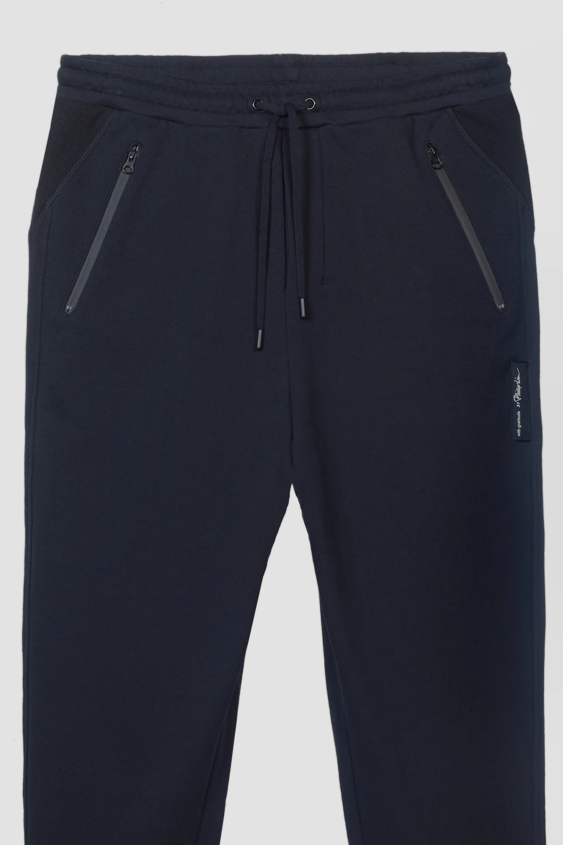 Essential tapered jogger with elastic drawstring waist, side zip pockets, and ribbed cuffs in french terry cotton.