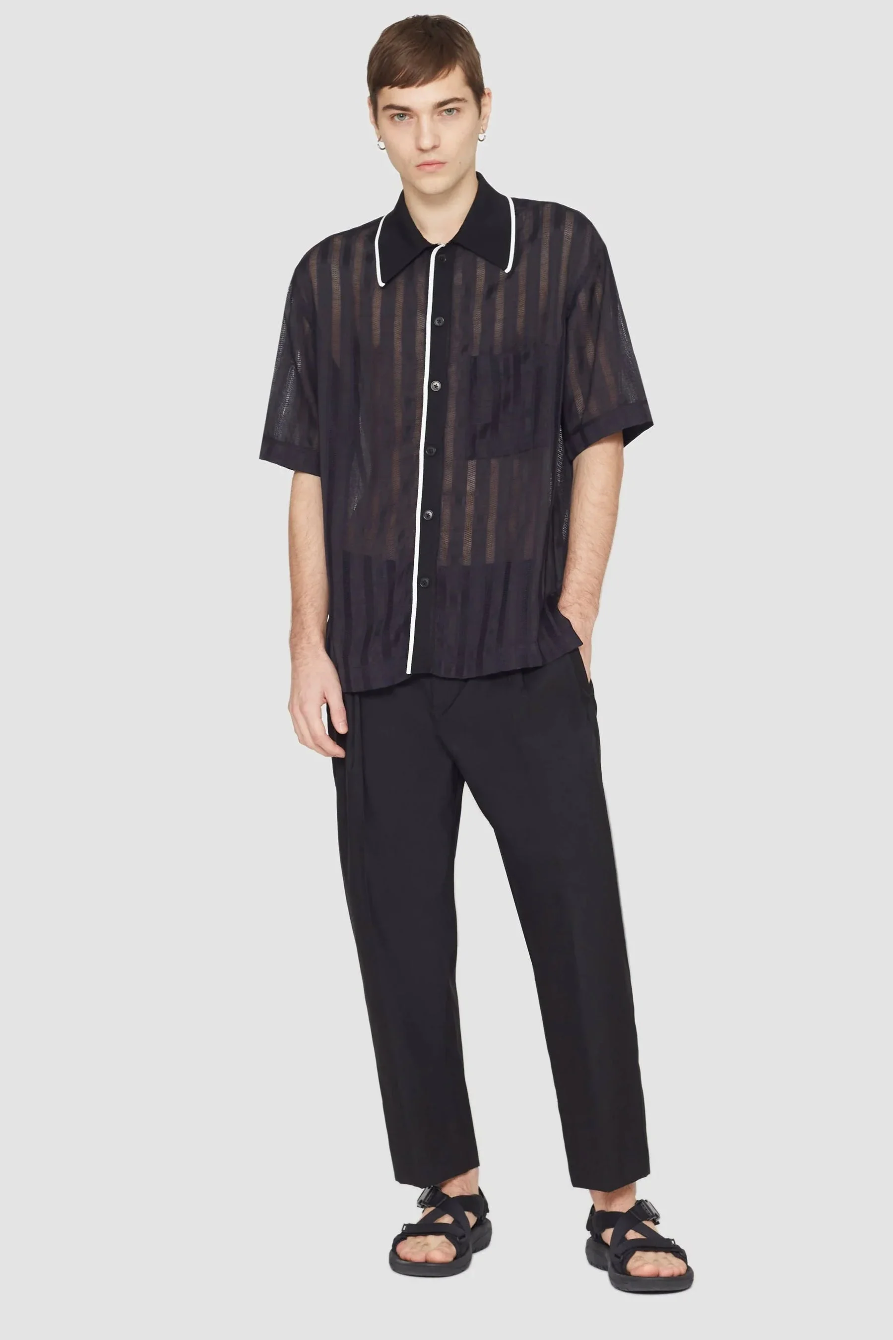 Short sleeve bowling shirt in a striped open weave. Ribbed knit point collar and placket with contrast tipping. Chest patch pocket. Button front closure. Relaxed fit. - Ribbed-knit point collar and placket - Short sleeves - Chest patch pocket - Button front closure - Relaxed fit - Model Height: 6' 1/2, Waist: 29', Hips: 35' and wearing a size M