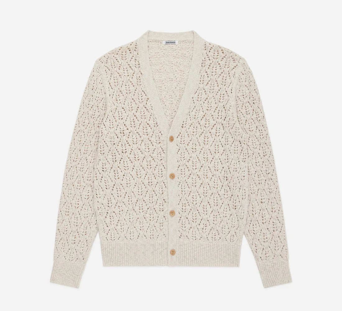 The Classic Cardigan is a play on the traditional v-neck cardigan. This season, we opted to have it knit in a loose, open lace knit pattern in a soft yarn blend. The yarns are made up of a Peruvian Pima cotton with a wonderful flamme texture that adds great variation and an almost boucle effect to the final piece. This sweater is finished with front raglan shoulder detailing, ribbed cuffs and hem, and a simple collar. Made in Peru. Details - 100% Pima Cotton - Corozo fisheye buttons - Knit in Peru