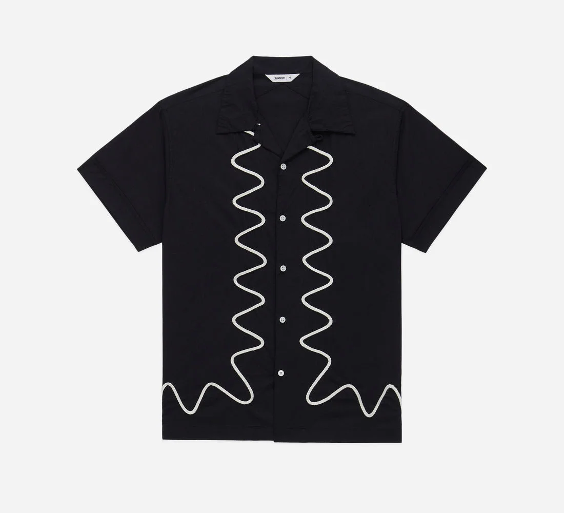 Our Vacation Shirt design takes inspiration from classic open-collar leisure shirts of the 50's coupled with an updated, modern fit. The shirt can be worn with the collar open or buttoned all the way up with the loop. This iteration is cut in a 100% cotton poplin fabric with a dry hand that's contrasted with a textured cotton rope applique running down the front and along the hem. Details - 100% Cotton - Single front chest pocket - Open collar - Mother of pearl buttons - Crossed back yoke - Made in India