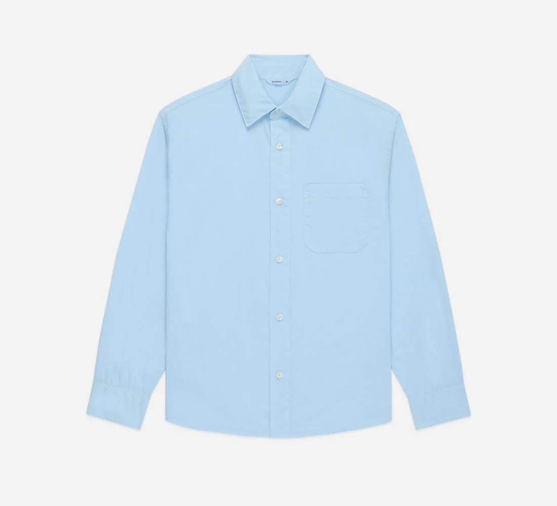 The Admin BD Shirt is our casual variation on a classic dress shirt, much like our Commuter Shirt. This version utilizes a crisp, lightweight poplin fabric that's breezy and comfortable. After sewing, the shirt is put through a garment dye and wash process to further soften it. The shirt is cut with a wide chest and shoulders and looser sleeves. Generous proportions are matched with a carefully considered body and sleeve length so the shirt maintains its oversized feeling without appearing too big. It's finished with a single chest pocket and mother of pearl buttons. Details - 100% cotton fabric - Garment dyed - Mother of pearl buttons - Made in Portugal