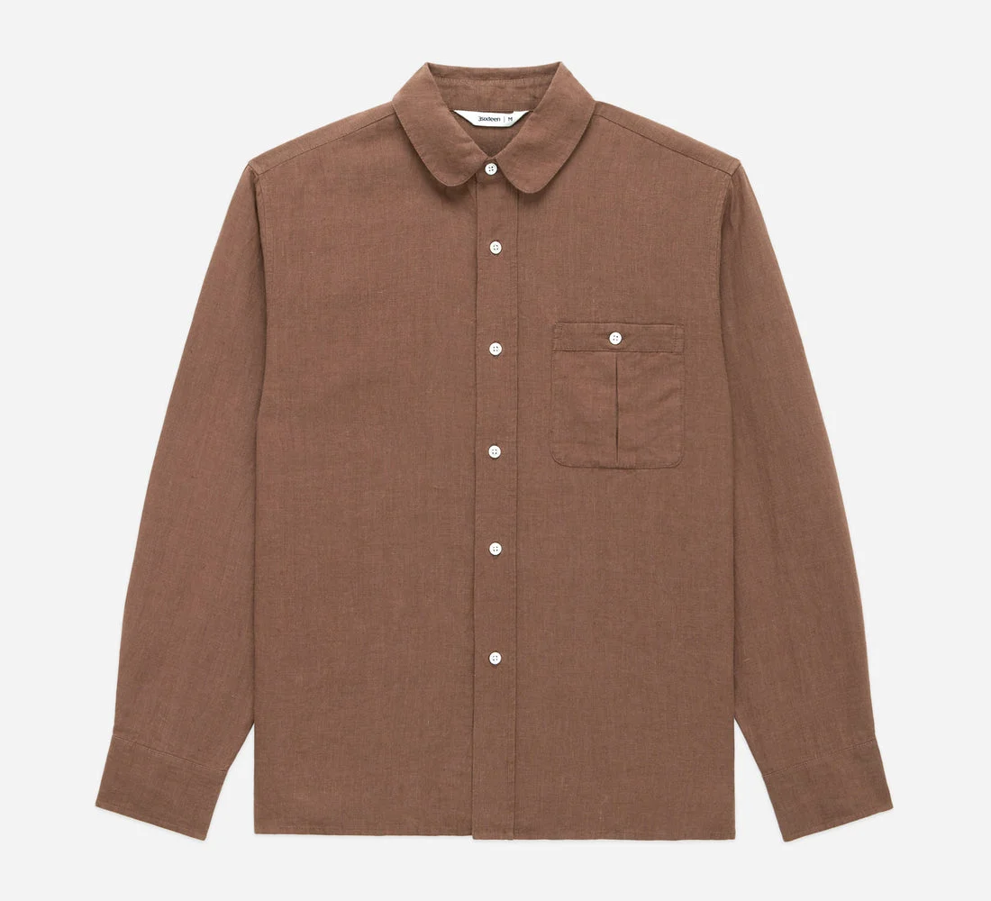 With a bellow front pocket and inverted box pleated back, the Club Collar deviates in many ways from it's classical counterpart. The hemp fabric it's made with has a extremely textured hand that will become more pronounced as it's worn and washed. Details - 100% hemp fabric - Mother of pearl buttons - Garment dyed - Made in India