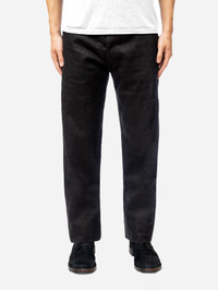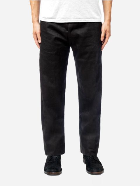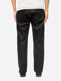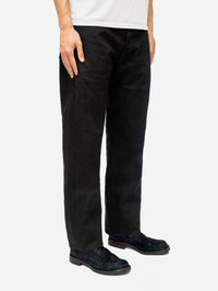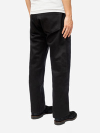 The CS-220x jean is cut and sewn using our custom woven Double Black selvedge denim, which consists of black warp and black weft threads. Our CS cut is based off a vintage 1947 501 fit and features a straight back yoke that results in a higher rise. The jean has a fuller thigh than our other fits and has a slight taper to the leg opening. While black denim is more resistant to fade than indigo, with time this denim will eventually fade to grey in high wear areas. Made in USA. Details - 14.5oz raw black warp/black weft selvedge woven in Okayama, Japan - Custom branded gunmetal shanks and rivets by YKK - Selvedge fly and coin pocket detailing - Black roughout leather patch - Made in USA