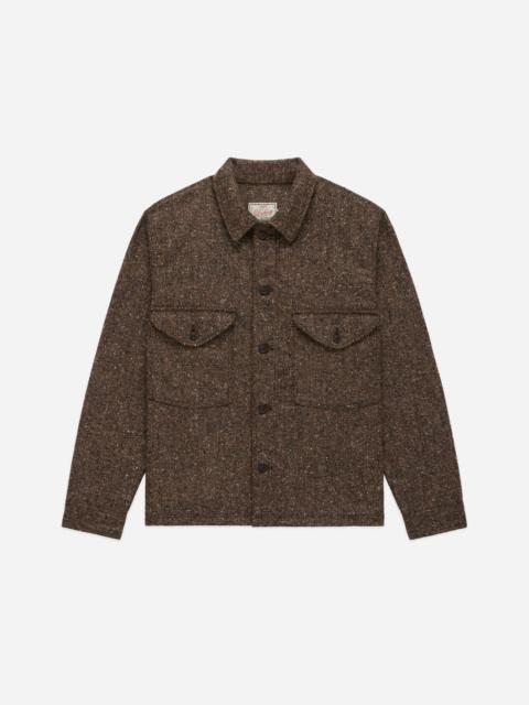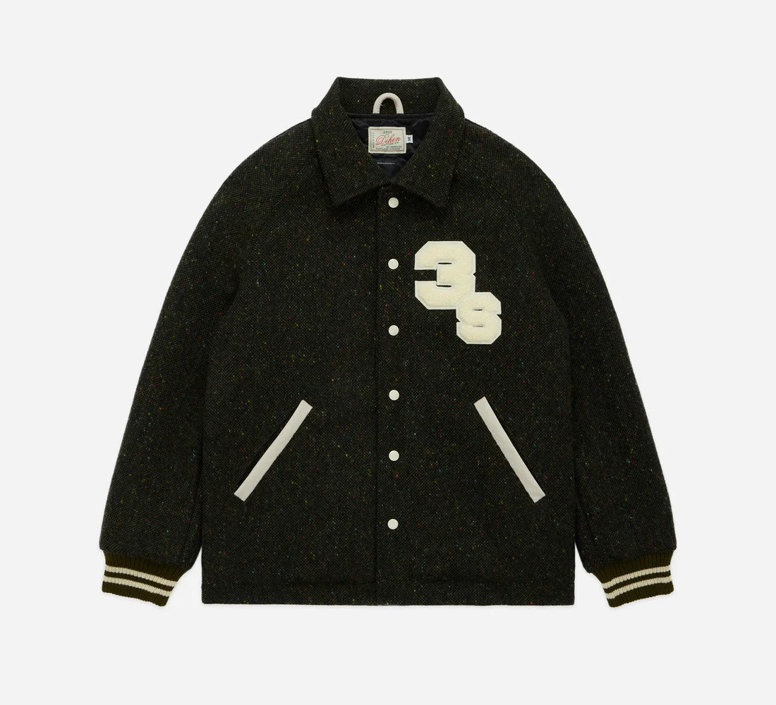 The Campus Jacket is our second collaboration with Dehen Knitting Company. Founded in 1920, Dehen has been proudly manufacturing heavy duty outerwear from their headquarters in Portland, OR since their inception. For our 20th anniversary collaboration, we custom developed a hefty tweed with Irish weavers Molloy & Sons in a dynamic loden green yarn with rainbow flecking. The jacket is finished with a traditional chenille logo applique, heavyweight wool ribbed cuffs, leather welts, and enamel-painted snap closures. Made in USA. Details - 800GSM custom woven tweed fabric - 100% worsted knit wool trim - Quilted Satin lining - Chenille 3s appliqu - e - Leather pocket welts - Snap front closure - Made in USA