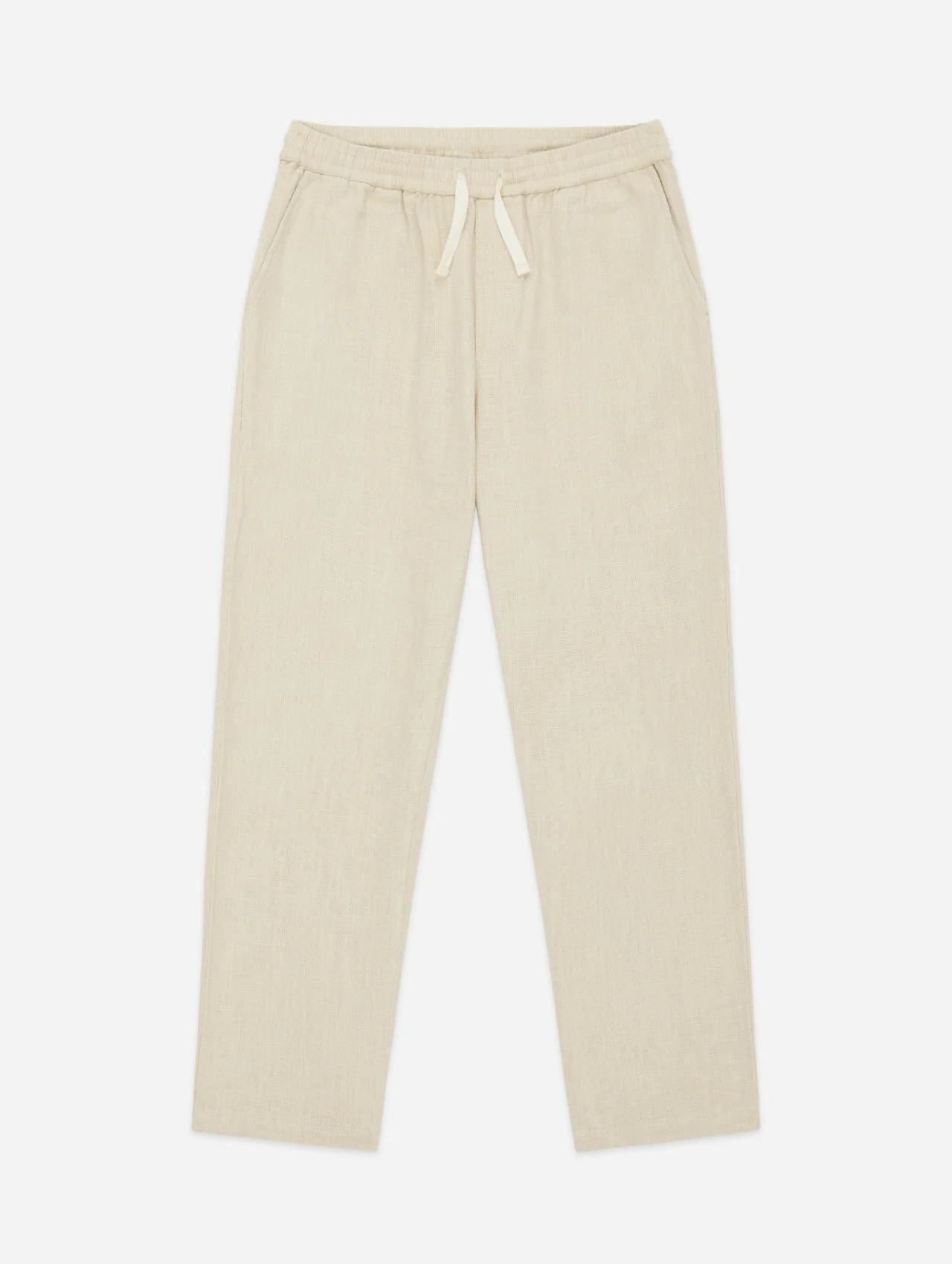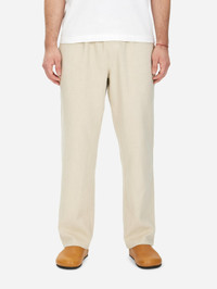 The Easy Pant features an elastic drawstring waistband and single front pleats. The fit is inspired by our CS cut - roomy top block with a straight leg - and is cut with a short inseam and longer rise. The pant is finished with reinforced rear patch pockets for added durability. This season we developed a heavyweight cotton/linen blend fabric thats drapes and breathes beautifully. SIZING: Please note that our measurements are taken with the waist laid flat with no stretch. The elastic waist can stretch up to 4". We recommend taking the same size as our tops for the standard fit or one size up for a more relaxed fit. Details - 55% Linen/45% Cotton - Drawstring and elastic waist - Reinforced pockets - Straight leg fit - Made in India