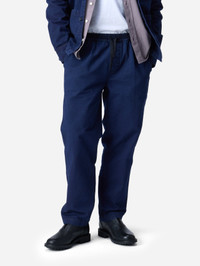 The Easy Pant features an elastic drawstring waistband and single front pleats. The fit is inspired by our CS cut - roomy top block with a straight leg - and is cut with a short inseam and longer rise. The pant is finished with reinforced rear patch pockets for added durability. This season we chose a 10.5 oz Japanese indigo canvas woven by Yamaashi Orimono with a deep hue that fades exceptionally with wear. Details - 10.5 oz Japanese Indigo Canvas - 100% Cotton - Drawstring and elastic waist - Reinforced pockets - Straight leg fit - Made in India