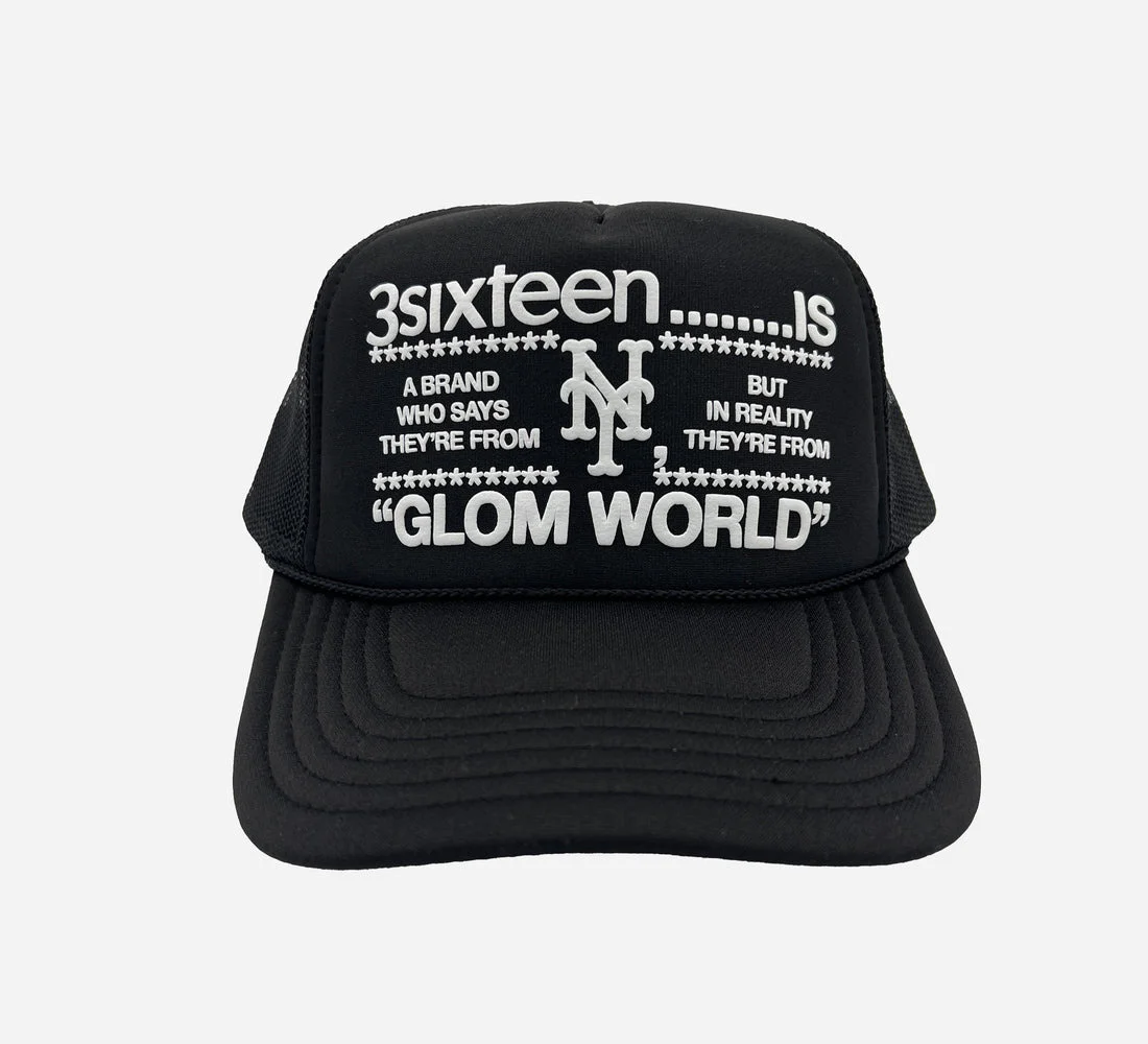 The "Glom World" trucker hat was designed exclusively for our in-store NY performance on November 23rd. The trucker has a foam panel with mesh side and back panels, with a woven rope detailing across the visor. The hat features a white puff print on the front. Details - 100% polyester - Structured foam panel with lining - Curved Visor with 6-row stitching - Terry sweatband - Plastic Adjustable Snap - One size fits most