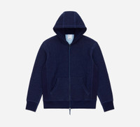 We've updated our heavyweight hoody with several improvements from previous runs: it now features an even beefier 500gsm fleece and a slimmer fit. The hoody also sports a black YKK double zipper and black rawhide leather zip pulls. Lastly, the hood drawstring has also been eliminated for a cleaner look. The yarn dyed indigo fleece has beautiful color variation which will only become more pronounced as it's washed and worn over time. Made in Canada. PLEASE NOTE: Remove leather zip pulls before washing. Details - Preshrunk heavyweight 500gsm fleece - Gunmetal YKK double zipper - 3 piece hood construction - Rawhide leather zipper pulls - 100% cotton - Made in Canada