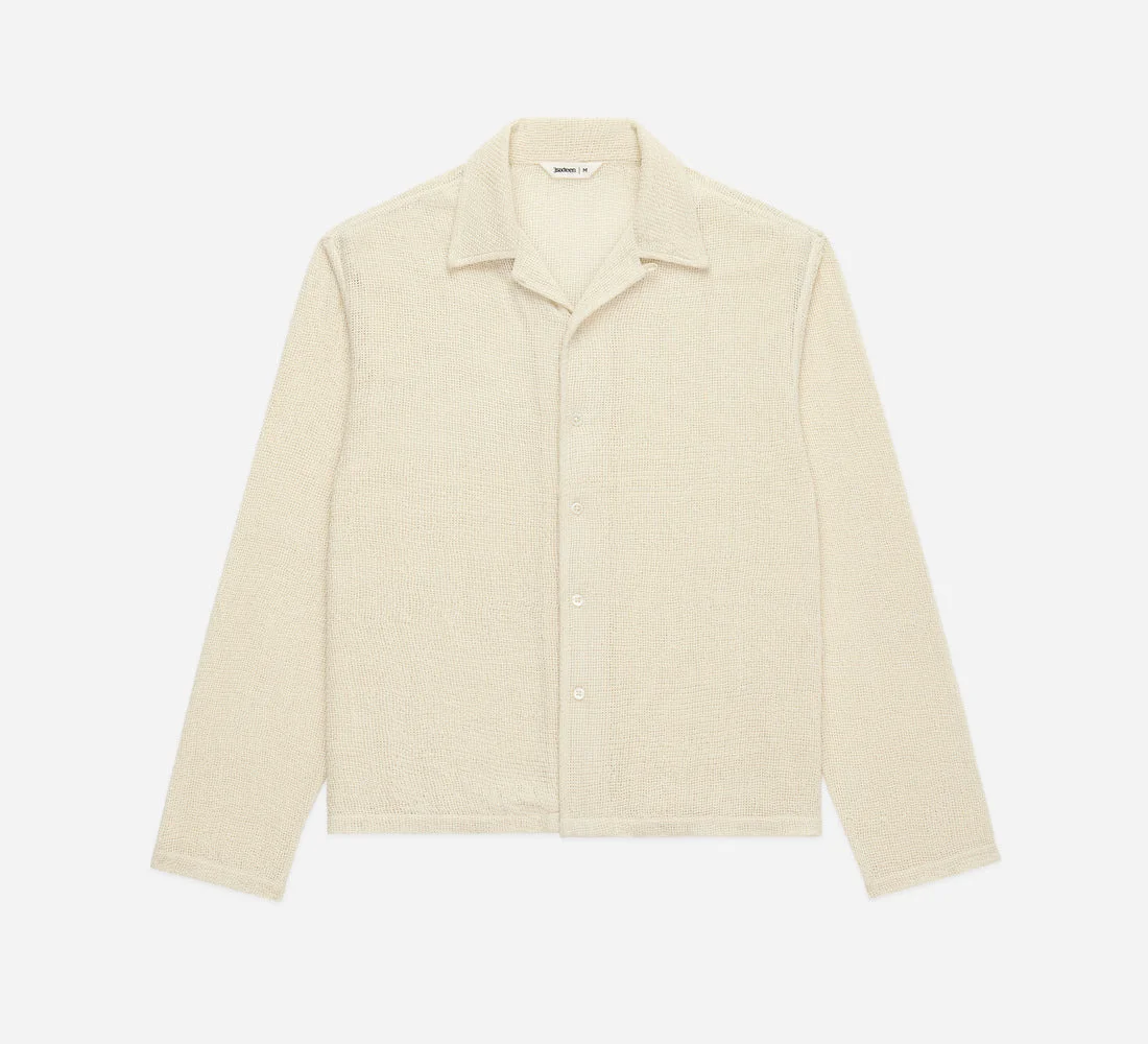 Our Loop Collar Shirt is modeled after vintage midcentury open collar shirts and features a slightly boxier cut than some of our other shirts. This season, we had an open weave cotton mesh fabric custom woven for us. The fabric is airy, breathable, and very comfortable. Details - 100% Cotton - Single front chest pocket - Open collar - Mother of pearl buttons - Made in India