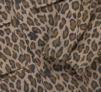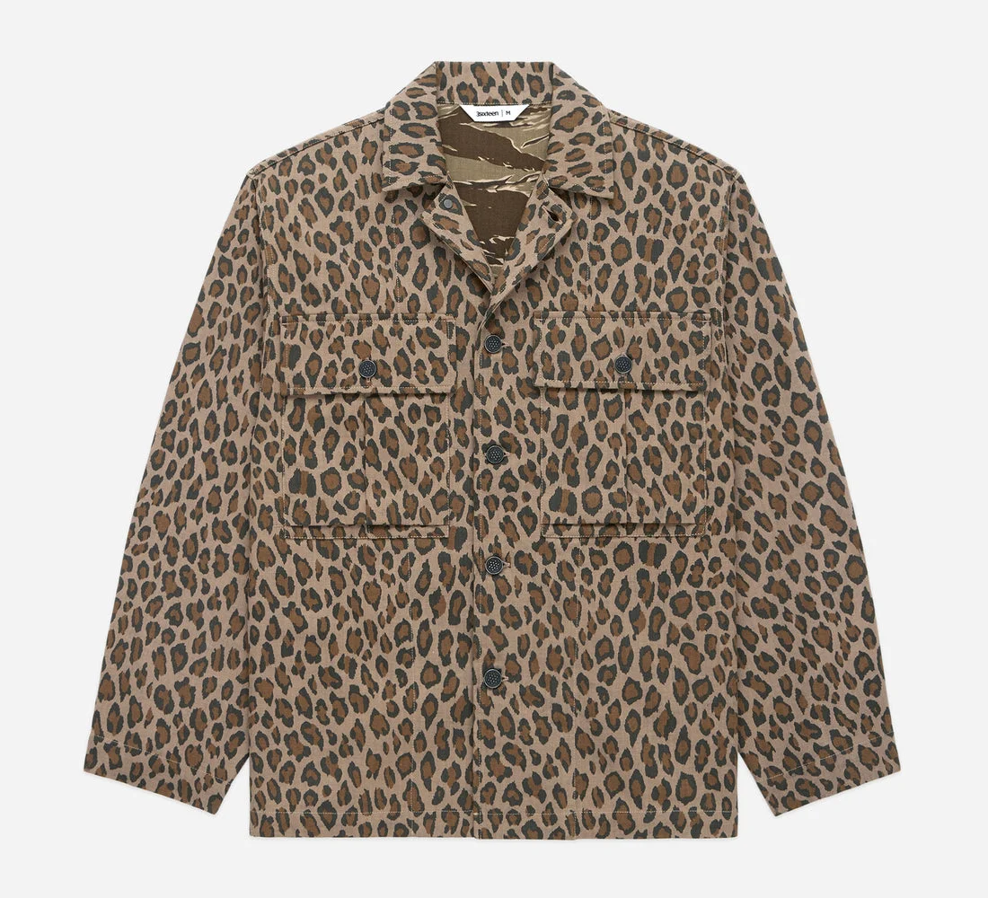 The M43 Overshirt is a modernized WWII silhouette that works well as a layer in colder months or as a jacket when it's warmer. It features a generous armhole and sleeve with button adjustment, two large pleated chest pockets, and replica thirteen star shanks. This jacket features a leopard print HBT fabric that's manufactured in Japan with a tiger stripe print on the underside; we like to think of this unusual juxtaposition of heritage alongside rockabilly as the kind of combo you wouldn't find elsewhere. Details - 100% cotton HBT fabric woven in Japan - Leopard print with desert tiger stripe print on underside - Pen pocket detail on left chest pocket - Crossed back yoke detail - Made in India
