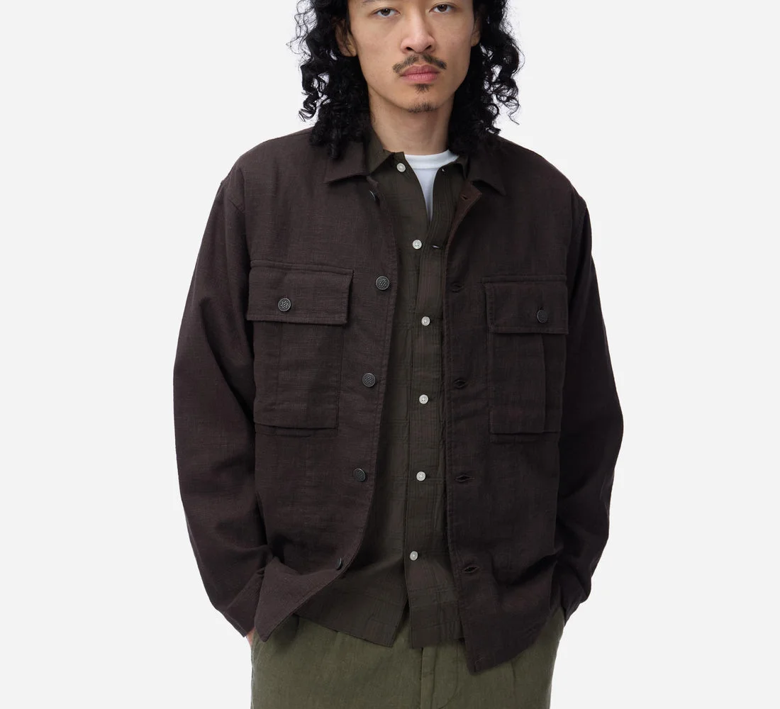 The M43 Overshirt is a modernized WWII silhouette that works well as a layer in colder months or as a lightweight jacket when it's warmer. It features a generous armhole and sleeve with button adjustment, two large pleated chest pockets, and replica thirteen star shanks. The heavyweight linen utilized on this piece starts out soft with a nice drape, and will continue to age nicely over time. Details - M - odel is 6'1" / 155lbs and wears a size Medium - 100% linen fabric - Replica 13-star button shanks - Made in India