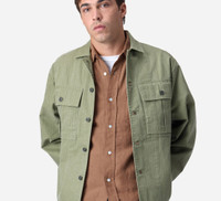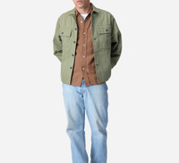 The M43 Overshirt is a modernized WWII silhouette that works well as a midlayer in colder months or as a jacket when it's warmer. It features a generous armhole and sleeve with button adjustment, two large pleated chest pockets, and replica 13-star shanks. The fabric is a beautiful pigment-dyed cotton that has a washed-out and faded look that is true to the vintage garments it references. Details - 100% Cotton pigment-dyed fabric - Relaxed fit - Two oversized chest pockets - Custom 13-star pewter shank buttons - Made in India