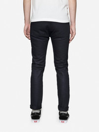 The NT-120x is a midweight raw indigo/black selvedge jean with a high rise and slightly roomier thighs, coupled with our smallest leg opening. This style utilizes our flagship 14.5 oz shadow selvedge denim (120x) which is woven exclusively for us by Kuroki Mills and will fade to a high contrast blue with wear. Additional details include custom gunmetal YKK hardware and a roughout leather patch. All our jeans feature super heavyweight 8oz cotton twill pocketing that is almost twice the weight of traditional pocketbags. Made in USA. Details - 14.5oz raw indigo warp/black weft selvedge woven in Okayama, Japan - Custom gunmetal shanks and rivets - Selvedge fly and coin pocket detailing - Heavyweight leather patch by Tanner Goods - 8oz heavy cotton twill pocketing - Made in USA