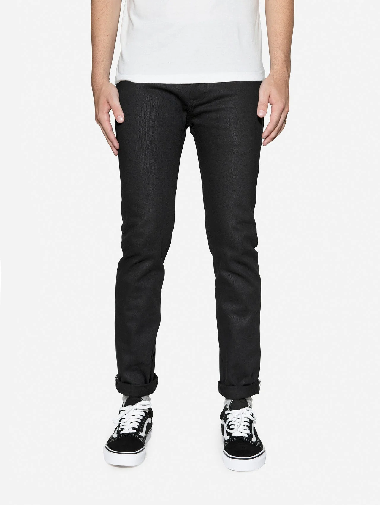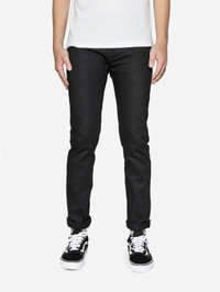 The NT-220x jean is cut and sewn using our custom woven Double Black selvedge denim, which consists of black warp and black weft threads. As our slimmest cut, the NT-220x features a high rise coupled with an aggressive taper from the thighs down. While black denim is more resistant to fade than indigo, with time this denim will eventually fade to grey in high wear areas. Made in USA. Details - 14.5oz raw black warp/black weft selvedge woven in Okayama, Japan - Custom branded gunmetal shanks and rivets by YKK - Selvedge fly and coin pocket detailing - Black roughout leather patch - Made in USA