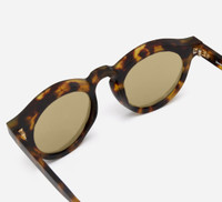The P3 Round SP-01 is a modern round lens frame with a classic midcentury-inspired keyhole nosebridge. Crafted by hand in Italy of 8mm bio-circular acetate, the construction of this frame shines in its combination of polished and raw finishes which give it depth and complexity. The legs are affixed with 5-barrel German steel hinges that sport functional triangular rivets and coated safety screws. Discreet branding comes by way of metallic logos on the outer temple tips, while the insides feature Japanese wave patterns laser etched in. This frame can be outfitted with prescription lenses by a licensed optician. Made in a family owned factory in Valdobbiadene, Italy. Details - 100% Italian bio-circular tortoise acetate - Polished face and temples - Raw, unfinished lens bevels, frame top and temple tops - 5-barrel German steel hinges with triangular rivet configuration - Temple tip logo branding - Anti-slip grooves on temple tips - Brown nylon lens with 100% UV protection - Can be fitted with optical lenses by an optician - Frame width 145mm / Lens width 47.5mm / Bridge width 23mm - Handcrafted in Italy