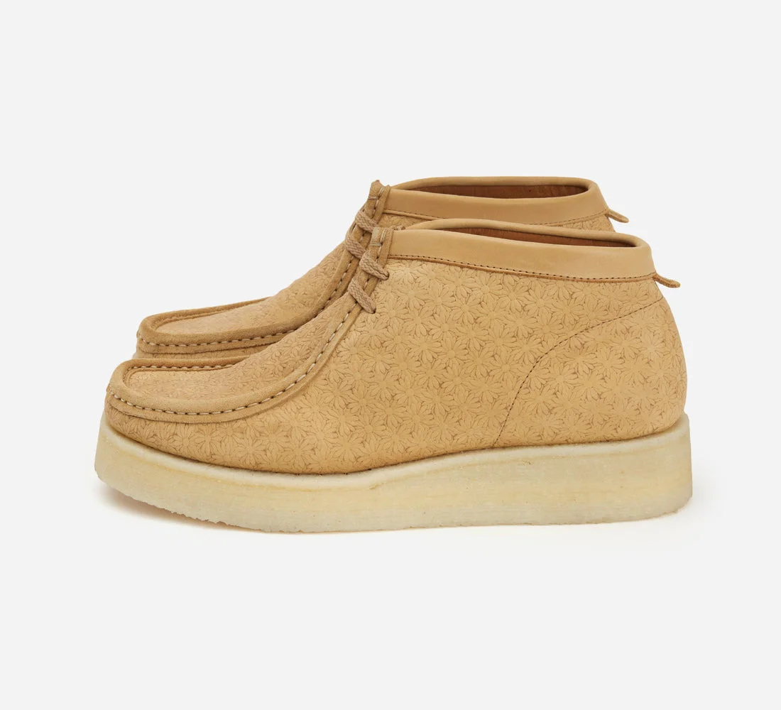 Our P404 Boot is crafted of an Italian vachetta leather with a stamped daisy motif. The vegetable tanned leather upper starts off as a beautiful natural color, and will patina and darken to a caramel brown with wear. Each shoe sits atop a double stacked tonal crepe sole and is finished with a simple tab on the back with our debossed logo SIZING: Padmore Barnes uses UK sizing - we recommend taking 1-1.5 down from your typical US sneaker size. Please note that the P404 is a wider F last, which might result in your correct size feeling roomier than what you're used to at first. When trying this shoe on, make sure there is no heel slippage and that the length of the shoe is correct to ensure you're in the right size. PLEASE NOTE: Sale items are final sale and are not eligible for returns. Details Details - P404 Boot style - Italian vachetta leather - Crepe sole - Leather lined - Made in Portugal