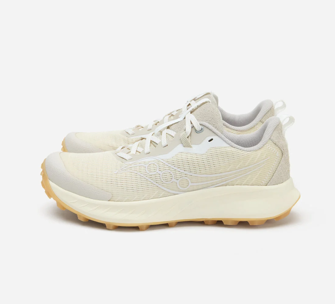 The Saucony for 3sixteen Peregrine 15 is inspired by the neutral color and bare nature of an artist's primed canvas. Much like our denim, the shoe will take on a life of its own as it is worn and dirtied. The shoe features all the technical detailing of Saucony's Peregrine model including a grippy PWRTRAC gum outsole, breathable high-strength mesh, and a PWRFOAM midsole for exceptional comfort, though we upgraded the model to have clear reflective hot-melt areas throughout and a hairy suede tongue and rear counter for added texture and off-trail wearability. Three pairs of laces are included - white (for dyeing), grey with reflective tracer, and white with tan. Details - PWRTRAC Outsole - PWRFOAM Midsole - Hairy Suede tongue and rear counter - Clear reflective hot melt panels - Reflective tracer laces - Made in Vietnam
